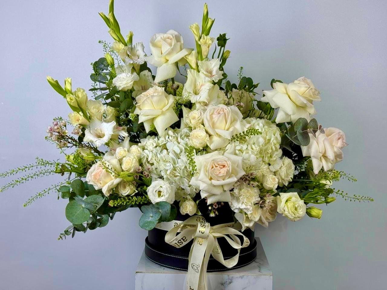 A graceful and calming arrangement, presented in a sleek box. Its elegant design adds a touch of tranquility and sophistication, making it perfect for any occasion that calls for pure beauty.