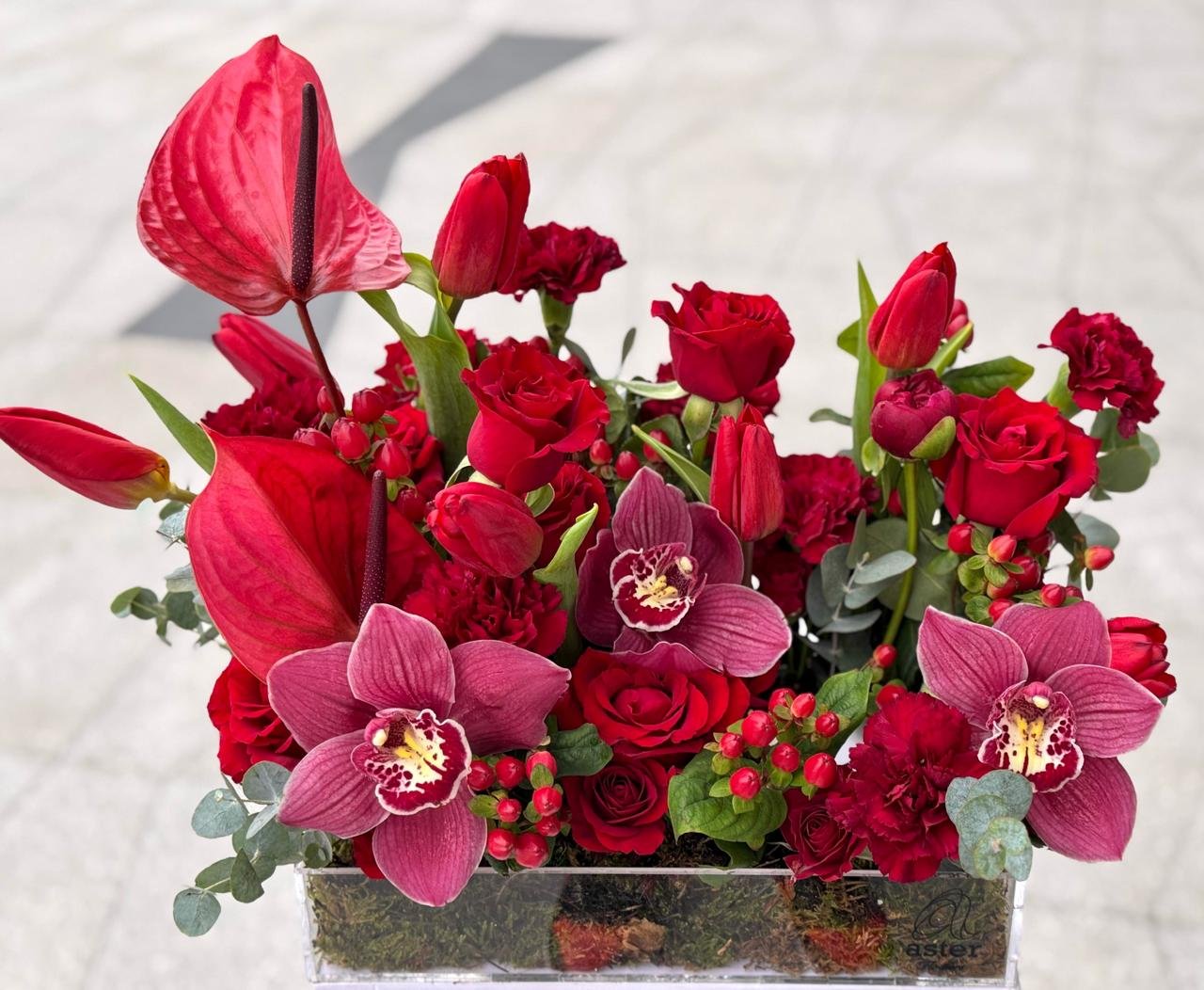 A striking arrangement of deep red flowers presented in a sleek tray, exuding elegance and passion. The vibrant hues bring a sense of warmth and energy, making it a perfect centerpiece for special occasions or as a thoughtful gift to add a touch of joy to someone’s day.